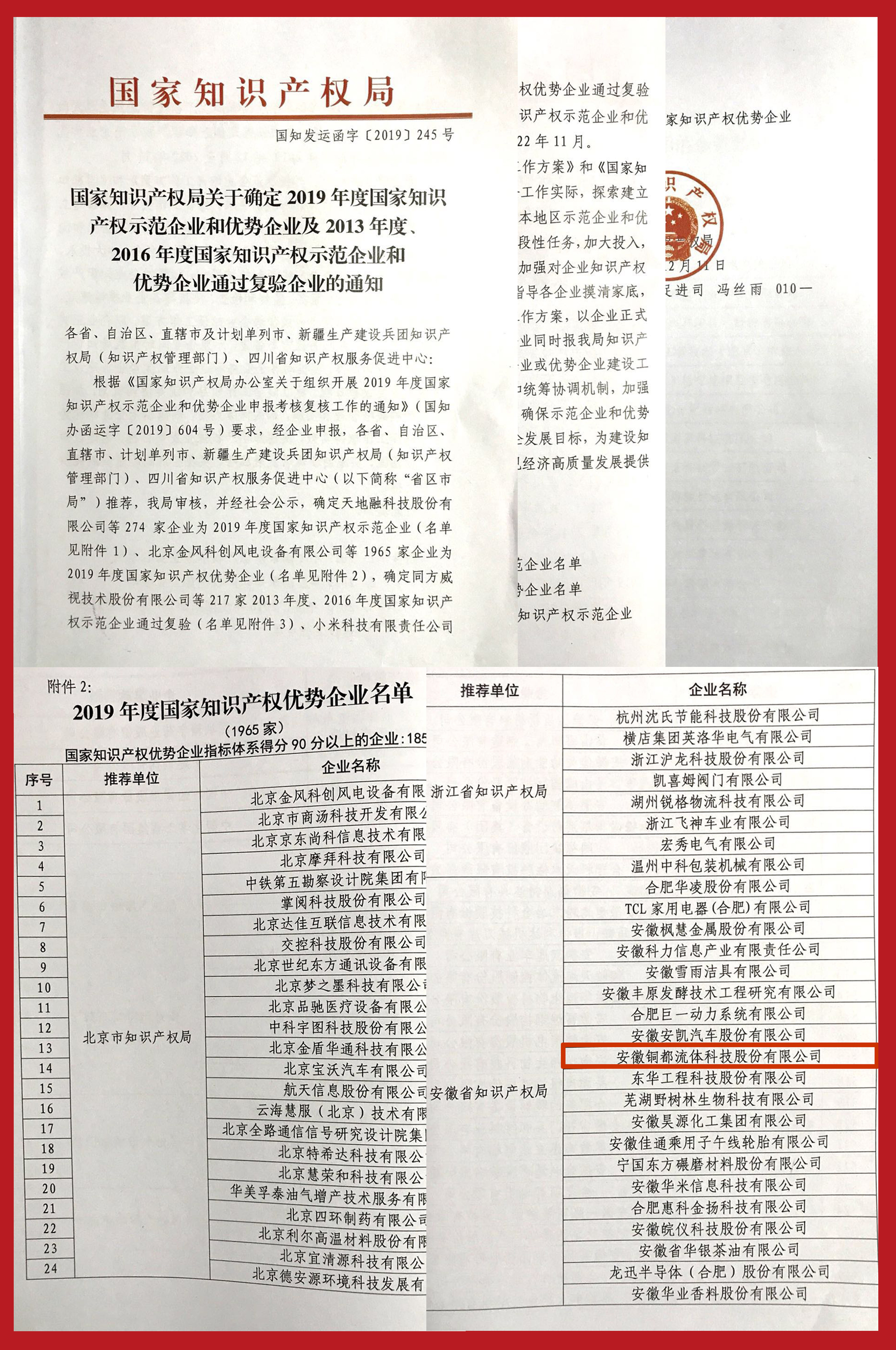 日前,国家知识产权局下发通知,公布了2019年度国家知识产权优势示范企业名单。铜都流体凭借良好的知识产权管理体系和强大的自主创新实力,荣获“2019年度国家知识产权优势企业”称号。